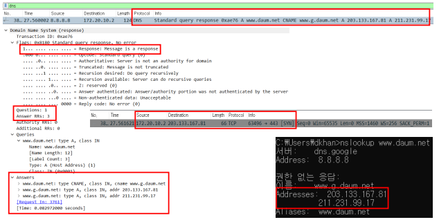 3. dns cache table 참조 - 해당 도메인(www.daum.net)이 저장된 경우 저장된 IP로 응답