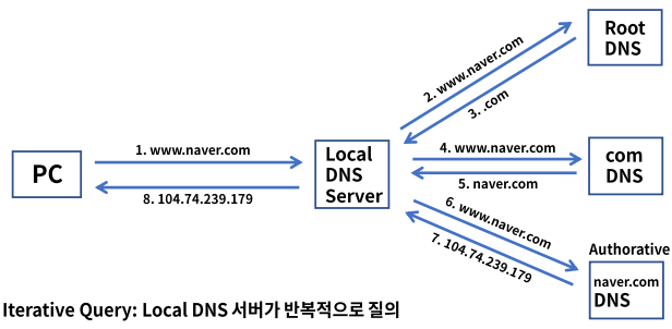 - Iterative Query : Local DNS 서버가 반복적으로 질의