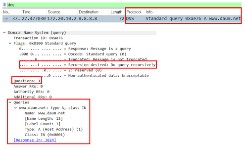 * DNS 메시지는 쿼리와 응답으로 구분되며 쿼리 전에 hosts.txt & DNS 캐시 테이블을 참조